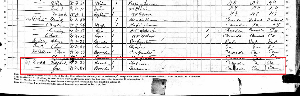 John and “Gilford” Dodd were enumerated as their own household, separate from the household of the boarding-house owner and the other tenants, which might be construed as evidence for a family relationship, rather than John and “Gilford” being two random boarders who happened to share a surname. In fact, “Gilford” is likely to be Gilbert M. Dodds, John’s brother, who was age 15 in the 1871 census, suggesting a birth year circa 1856. Gilbert does not appear in the 1881 census of Canada, and this record does a nice job of explaining why that might be. According to this census, “Gilford” was single and age 22, which points to a birth year circa 1858. He, too, was said to have been born in Canada of Canadian-born parents. Gilbert would eventually marry Annie Mann on 11 November 1885 in Port Stanley, Elgin County, Ontario8 and I’m pretty sure he died in Buffalo, New York,9 but that’s another story for another day. (I’m still waiting for his death certificate to arrive in the mail!)