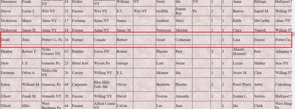 And there it is! Smoking-gun evidence that John Dodd [sic], the 34-year-old farmer residing in Potter County, Pennsylvania, who married Lina [sic] Frazier, was the son of Robert Dodd [sic] and Catherine Grant. John’s age suggests a birth year of 1857, a bit closer to the probable reality of 1853-1854, and he was born in Canada, as expected. One wonders if this was perhaps a second marriage for him, since a “1” was recorded in the “No. of marriage” column for Lena (indicating this was her first marriage) but there is no notation in the corresponding column for the groom. Of course, it may be that this information was merely omitted from the transcription. In a column on the far right, which does not appear in this image, it states that the marriage took place on 20 April 1891, which is an approximate match to the information from the 1900 census that they were married in 1892. In fact, when I wrote to the Willing town clerk to request a copy of the actual marriage record, she informed me that the marriage date according to their records was 20 April 1892, not 1891, so mistakes do happen. It may be that the original record is exceptionally faded or illegible, which impacted the indexer’s ability to read both the marriage date, and any information that may have been recorded in the “no. of marriage” column for the groom.