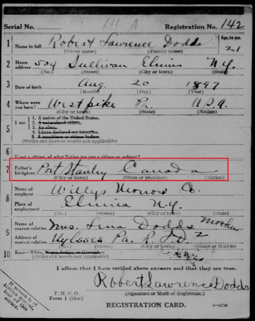 10 “United States World War I Draft Registration Cards, 1917-1918,” database with images, FamilySearch, (https://www.familysearch.org/ : 8 May 2021), Robert Lawrence Dodds; Pennsylvania > Potter County; A-R > image 1017 of 3424; citing NARA microfilm publication M1509 (Washington, D.C.: National Archives and Records Administration, n.d.).