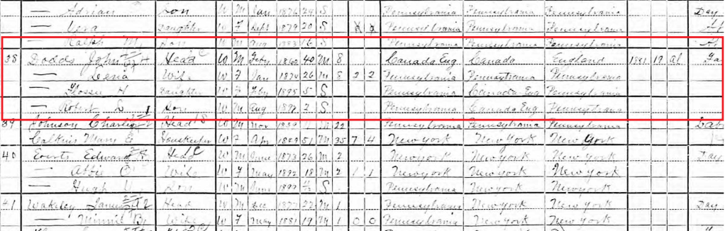 By 1900, John had been married to his wife, Lena, for eight years, suggesting that they married circa 1892. John was employed as a farmer who owned his own farm. He was further reported to be an alien who had been living in the U.S. for 19 years, following his arrival in 1881. The year of arrival would explain his absence from the 1881 census of Canada. Lena Dodds was born in Pennsylvania, as were both of her parents. She was noted to be the mother of two children, both of whom were living at that time and appear in this census. Those children were Flossie H. Dodds, born February 1895, and Robert L. Dodds, born August 1897.