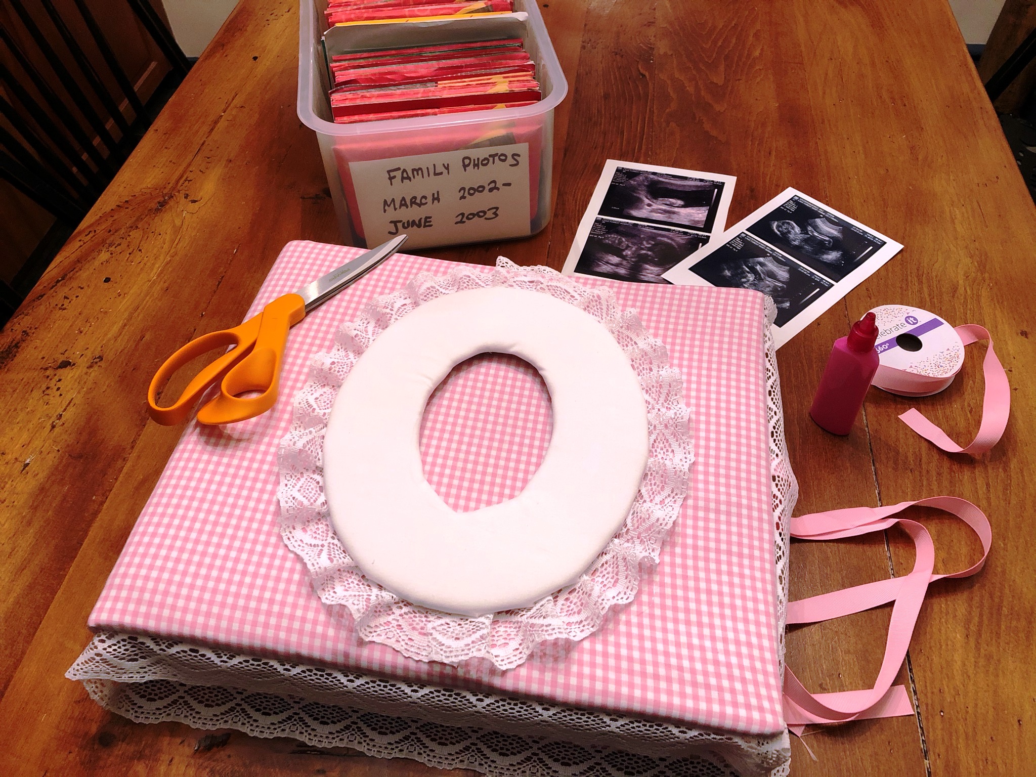 The album was originally just a plain photo album. I personalized it by covering it with fabric, lace, a photo frame on top with her name and birth date written on it, and adding ribbon ties.