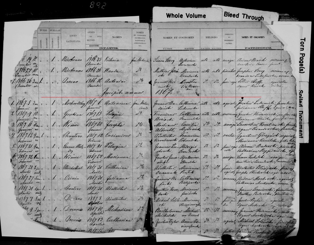 However, the proof is in the pudding, as they say, and until an actual birth record is found, one can’t make any definitive claims. So, I sought a birth record for Augustyn Drajem circa 25 July 1866 in the records from Niestronno.