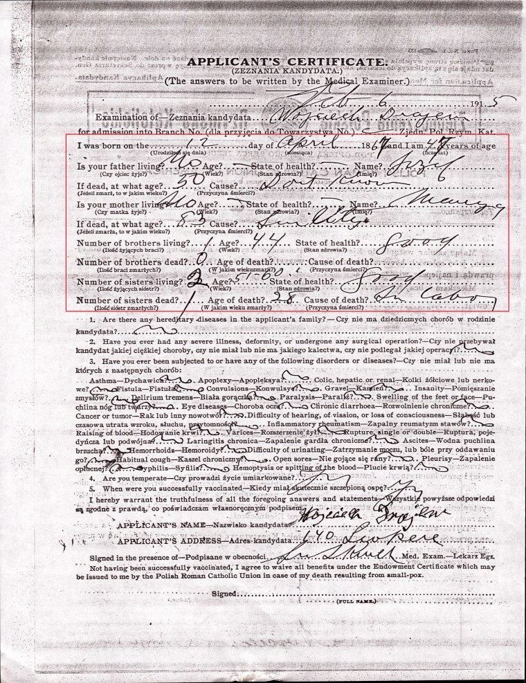 What tipped me off was her place of birth, recorded on the second page of her passenger manifest as “Kostrzynie.” Marriage records for Antoni Bogacki and Jadwiga and Marya Tądrowska identify the Tądrowskis’ birthplace as “Kostrzyn, Boruss[ia],” i.e. Kostrzyn, Prussia, as do baptismal records for five of Jadwiga’s children.[6] Jadwiga’s death record similarly identifies her birthplace as “Kostrzyn, Pos[e]n.”[7] The baptismal record for her youngest son, Zygfryd, identifies Jadwiga’s birthplace as “Kościerzyna, Boruss[ia],” which is a different place in Poland, but the body of evidence points to Kostrzyn as being the correct place of origin for the Tądrowski family.[8] The variant spelling recorded on the passenger manifest, “Kostrzynie,” reflects the grammatical declension inherent to the Polish langauge: to say, “I was born in Kostrzyn” in Polish, I would say, “Urodziłam się w Kostrzynie.” A similar conversation probably took place when the passenger manifest was recorded.