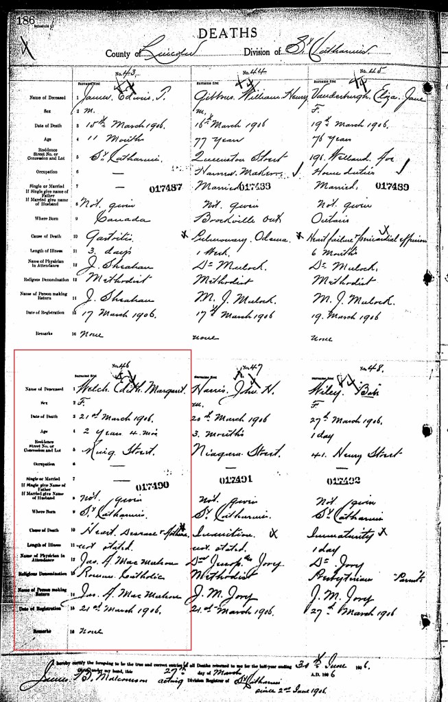 Figure 3: Death certificate for Edith Margaret Welch, who died in St. Catharines, Ontario, on 21 March 1906. Click image to enlarge.