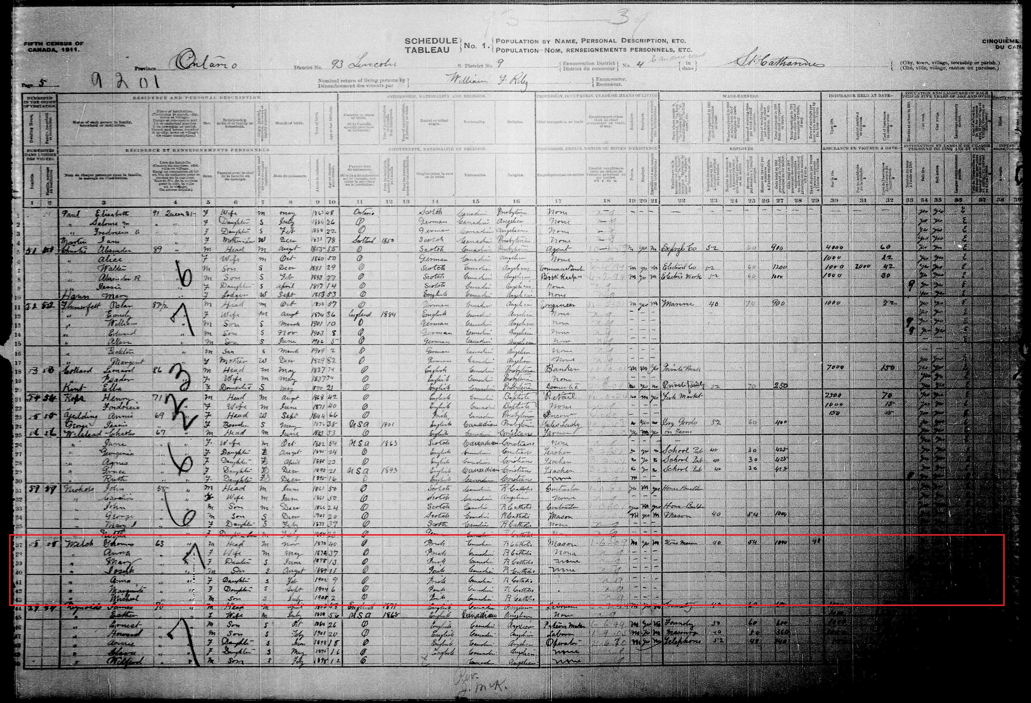 111911 Census of Canada, Ontario population schedule, Lincoln District no. 93, St. Catharines City Sub-district no. 39 (St. Andrews Ward), Sheet no. 5, family no. 58, Thomas Welch household; digital image, Library and Archives Canada (https://www.bac-lac.gc.ca : 12 October 2022), citing microfilm T-20383, RG31—Statistics Canada, item no. 6330696, image no. e002000645.