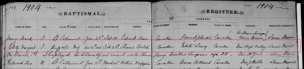 7Roman Catholic Church, Cathedral of St. Catherine of Alexandria (St. Catharines, Ontario, Canada), Parish Registers, 1852-1910, Baptisms, 1860-1906, p 169, unnumbered entries in chronological order, Edith Margaret Welch, born 25 November 1903; digital image, FamilySearch (https://www.familysearch.org : 12 October 2022), FHL film no. 1309899/DGS no. 5107195, image 171 of 177.