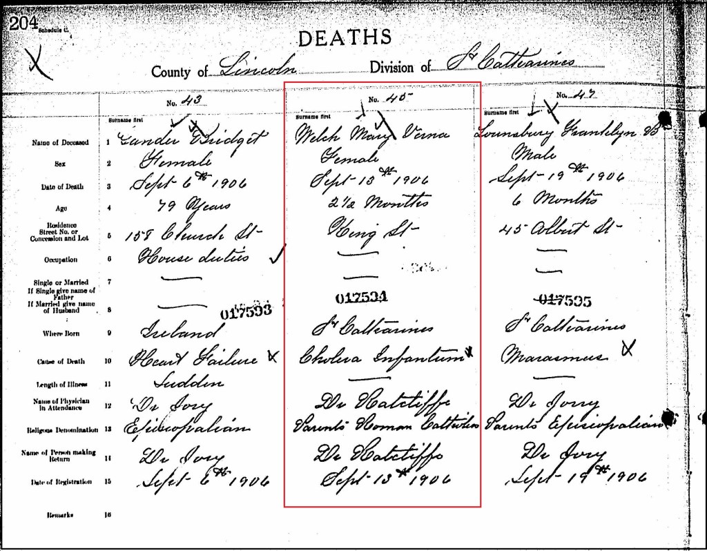 14 “Canada, Ontario Deaths, 1869-1937 and Overseas Deaths, 1939-1947,” database with images, FamilySearch (https://familysearch.org/ : 12 October 2022), Mary Verna Welch, 13 Sep 1906; citing St Catharines, Lincoln, Ontario, yr 1906, certificate no. 17594, Registrar General, Archives of Ontario, Toronto; FHL microfilm 1,854,401.