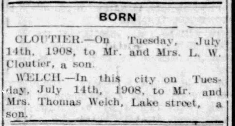 9 Ibid.,15 July 1908 (Friday), p 3, col. 5, birth notice for unnamed son of Thomas Welch; digital image, Newspapers (https://www.newspapers.com : 12 October 2022).