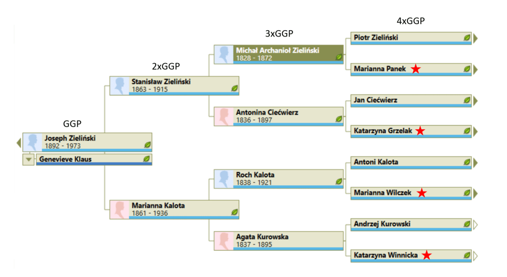 The individuals buried here are either descended from the patriarch and matriarch, Józef and Apollonia (Prusiecka) Bogacki, through their son, Antoni Bogacki, and his three wives, Anna Burczykowska (m. 1879), Jadwiga Tądrowska (m. 1892), and Jadwiga’s sister, Maryanna Tądrowska (m. 1901), or else they married into the family. Those who married into the family, in addition to Antoni’s two wives, Jadwiga and Maryanna, were Kazimiera (Pawlicka) Bogacka, who married Jan Bogacki; Wiktoria (Niewczyk) Bogacka, who married Władysław Bogacki; Eugenia (Michalska) Bogacka, who married Henryk Bogacki; and Edward Kurpisz, who married Marcyanna “Marion” (Bogacka) Kurpisz.