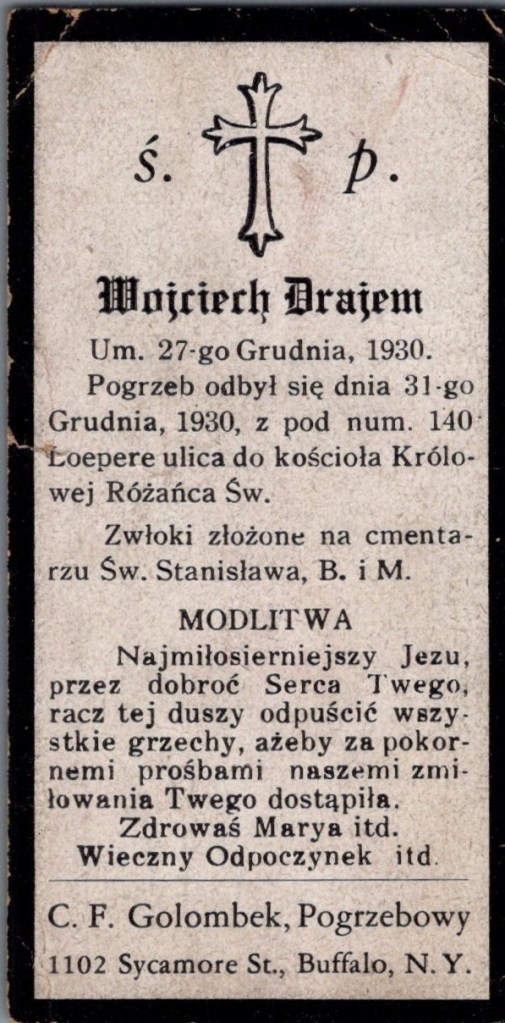 This search result reveals that Adam Bogacki was born to Antoni Bogacki and Maria Tądrowska on 2 July 1905, and he and died the next day. His death record is available here.[23] Similarly, Antoni and Maria lost another son, Venceslaus (Wacław in Polish) Bogacki, whose death record states that he was born 26 September 1907 and died one day later.[24] Cemetery records may help determine whether it’s Adam Bogacki who was buried in the family plot, and the grave marker incorrectly identifies his year of death (more likely), or whether it’s Wacław, and the grave marker incorrectly identifies his name. By the way, if you’re wondering where their baptismal records are, it may well be that Adam’s and Venceslaus’s baptisms were recorded at Transfiguration. However, baptismal records are only available for this parish up through 1903.