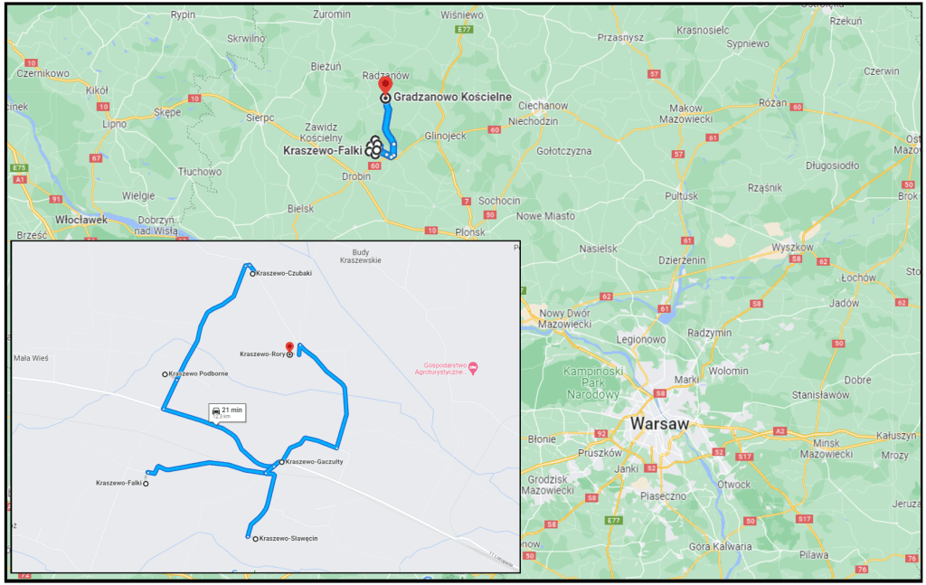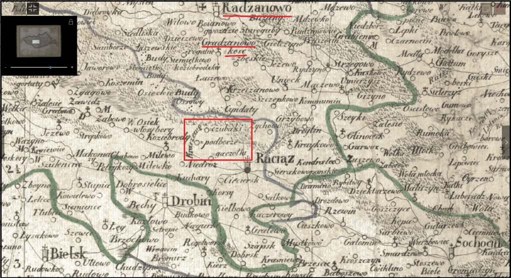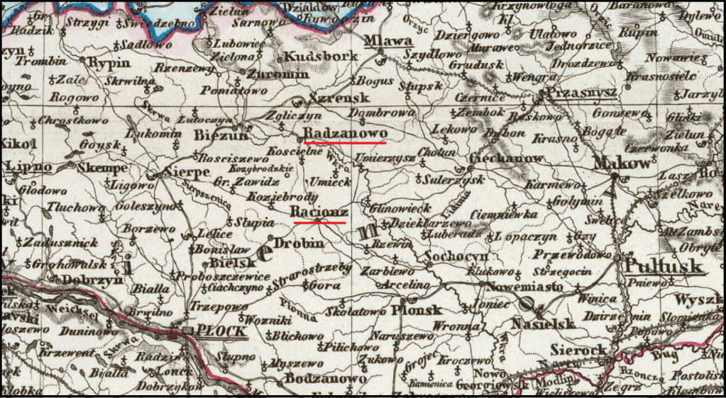 Helena Majczyk was born in the village of Rostowa (Żuromin County) to Stanisław and Aniela (née Nowicka) Majczyk. Their dates of death are unknown; however, we could extrapolate again, and assume that they died in the same village in which they were living when their last identified child was born. That child was Czesław, who was born in 1905 in the village of Suwaki, about 8 km from Rostowa. Note that Czesław is merely Stanisław and Aniela’s youngest identified child: since Aniela was only about 36 when Czesław was born, it is likely that the couple had additional children born after him, who will be discovered in further research. Nevertheless, all the villages in which Stanisław and Aniela’s known children were born—Rostowa, Suwaki, and Bojanowa—belong to the parish in Gradzanowo Kościelne, so it’s plausible that Stanisław and Aniela might have been laid to rest in that parish cemetery.