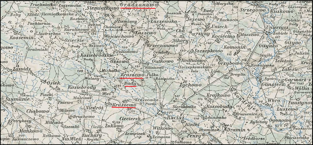 10 March 2023: After reading this article, researchers Ben Kman and Roman Kałużniacki wrote to me independently with a correction regarding my statement that, “there’s no evidence of an old Catholic cemetery in Izdebno, based on Google Maps…” Roman wrote, “There are two cemeteries which may be relevant here. Both of them are marked on the old maps of the area. One is located just half a mile south and on the West side of the road from Czewujewo. This one measures about 0.20 ha in size and is likely the real parish cemetery. But… The other one is quite hidden. It is located just West on the other side of the lake from Izdebno and its size is about 0.4 ha. I have a feeling there might be more to say about it.” Ben wrote, “There is a catholic cemetery in Izdebno. I have relatives living in Izdebno and my great-grandmother’s brother is buried in that cemetery. I visit it on every trip I take to Poland.” Thanks, Roman and Ben, for catching this error.