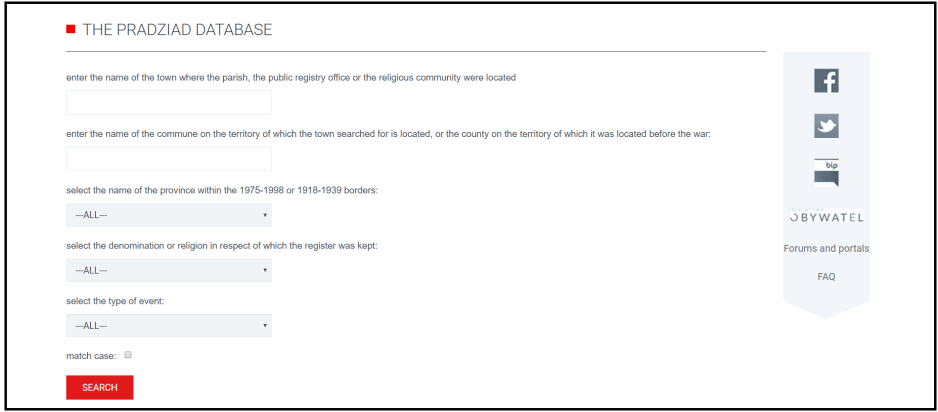 As you will have guessed by now, this database does not offer any information on individuals. It’s not a nominal index like Geneteka where the name of an ancestor can be searched. This database will only provide information on the vital-records holdings of the state archives (and a few additional archives, as noted above) for a particular location. A lack of results in PRADZIAD, does not imply that all the vital records for that location were destroyed, as vital records may still be found in the diocesan archive, the parish itself, or the USC (which would typically have the most recent 100 years of civil registrations, which are protected by Polish privacy laws). PRADZIAD offers no information on collections other than metrical books—such as census records, population registers, business records, town records, maps, photographs, notarial records, court records, etc.—which might be available for a given town. These can be discovered through a search at Szukajwarchiwach instead, where results will include all the holdings of the state archives related to a particular search term, including metrical books, where applicable. (For more information on using Szukajwarchiwach, a tutorial is available here.) Finally, search results displayed at PRADZIAD will not offer any indication of which collections might be found online and which can only be obtained by other means. It’s up to the researcher to perform his own due diligence before writing to the archive to request a search. (Examples of sites which offer online scans of vital records from Polish parishes include Szukajwarchiwach, Genealogia w Archiwach, Metryki, GenBaza, FamilySearch, etc.)