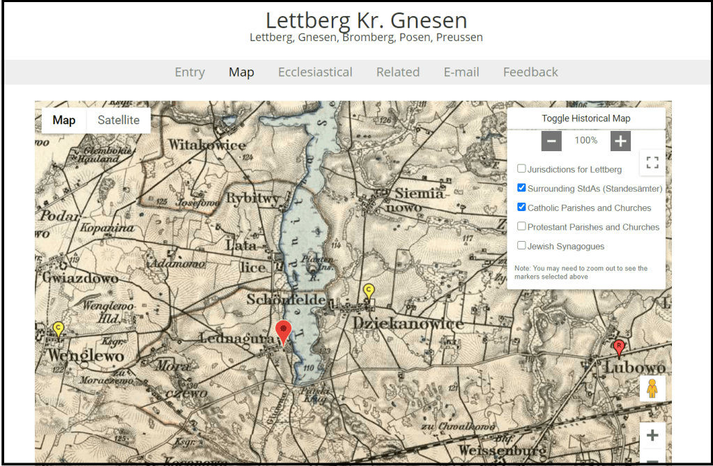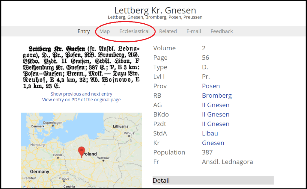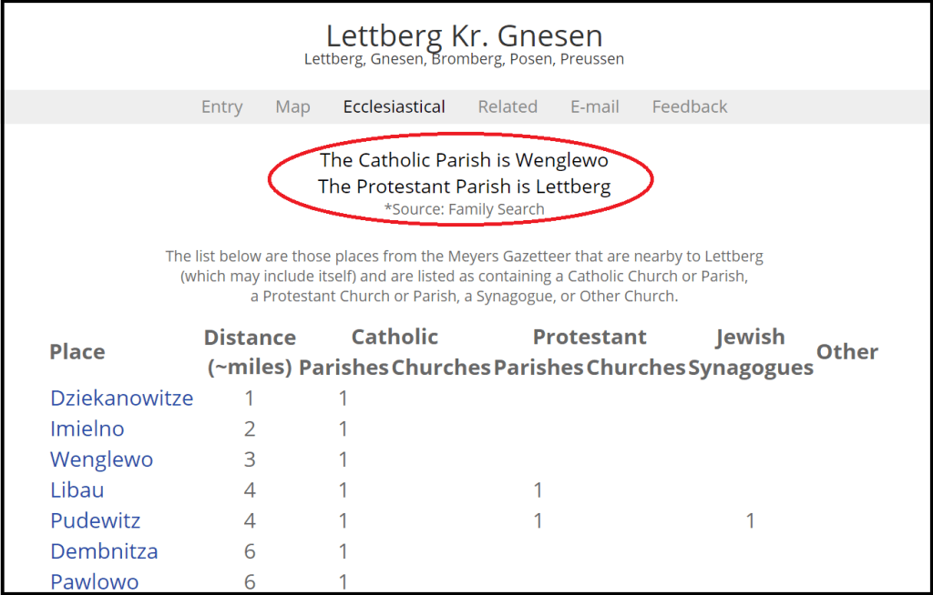 Diacritics are not required here, either, so I can search for “Dabrowa,” and find a list of all the parishes in Poland with “Dąbrowa” as part of the name (Figure 3).