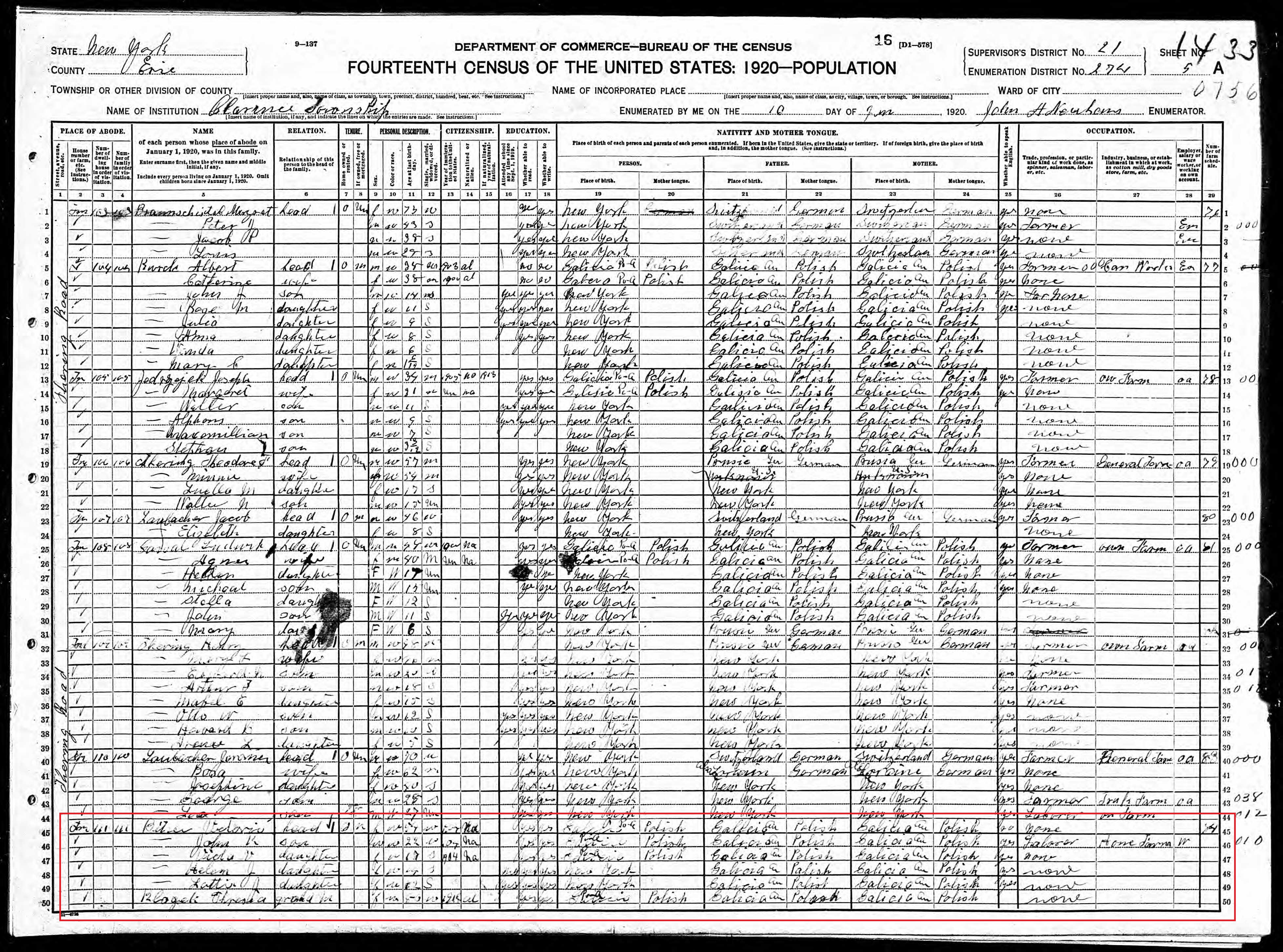 In 1920, the Bitner family—spelled with only one “t” this time—was living in Clarence, New York, rather than within the city of Buffalo. However, careful examination of the data for each family member allowed me to be certain this was still the same family. Once again, Victoria Bittner was reported to be a widow, whose native tongue was Polish and who was born in Galicia circa 1866. In this context, “Galicia” refers to the Galicia region of the Austrian Empire, a region which spans what is now southeastern Poland and southwestern Ukraine. Although Victoria’s age (and therefore her predicted birth year) are a few years off from our expectations based on the 1925 census, the data are nonetheless well within the typical margin of error observed in records for Polish immigrants of this era. She reported an immigration year of 1904, and—in contrast to the 1925 census—this record states that she was naturalized, although the exact year of naturalization was not recorded.