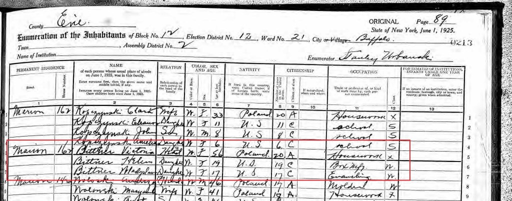 In 1925, Helen Bittner was 19 years old, living with her 56-year-old mother, Victoria, and her 17-year-old sister, Władysława, at 162 Marion Street in Buffalo. Helen was employed at a box manufacturing factory, and Władysława’s occupation, “enameling,” suggested that she was employed in some aspect of the porcelain enamel coatings industry. Both Helen and Władysława were born in the U.S., while their widowed mother, Victoria, was born in Poland. Victoria’s age suggested a date of birth circa 1869, and she was noted to have been living in the U.S. for 20 years, which suggested an arrival date of about 1905. According to this census, Victoria was still an alien in 1925, and if this is correct, then it’s unlikely that she petitioned to naturalize, since she died in 1928.2
