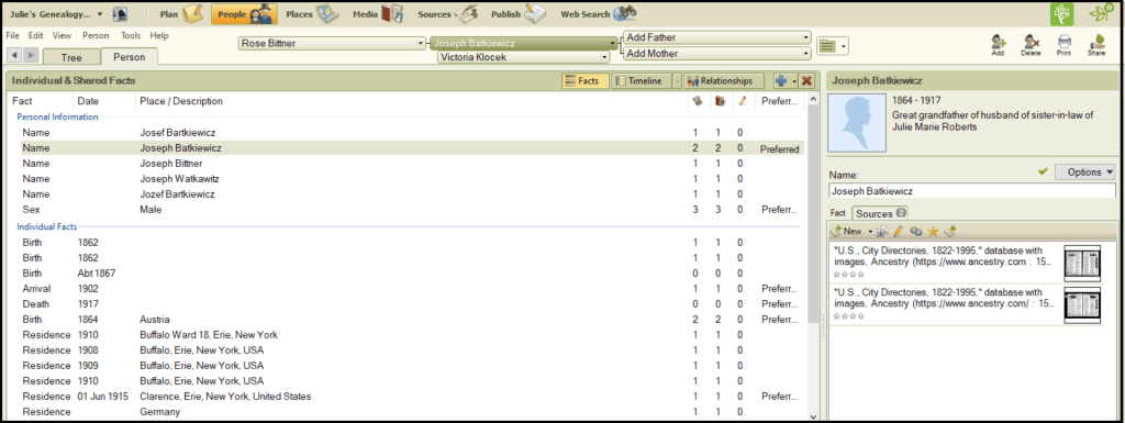 Figure 6: “Person View” for Joseph Batkiewicz in my Family Tree Maker software, showing multiple name facts with source citations attached to each. Click image to enlarge.