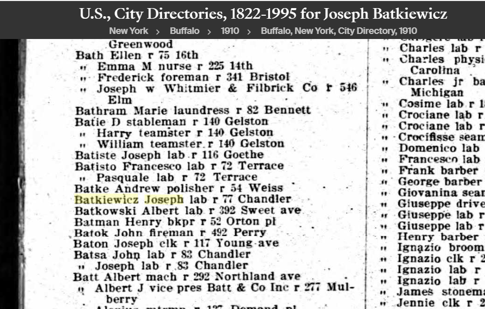 Ibid., Batkiewicz, Joseph, 77 Chandler St., Buffalo, New York, USA, 1910; citing The Buffalo Directory (Buffalo, New York: The Courier Company of Buffalo, 1910), p 171.