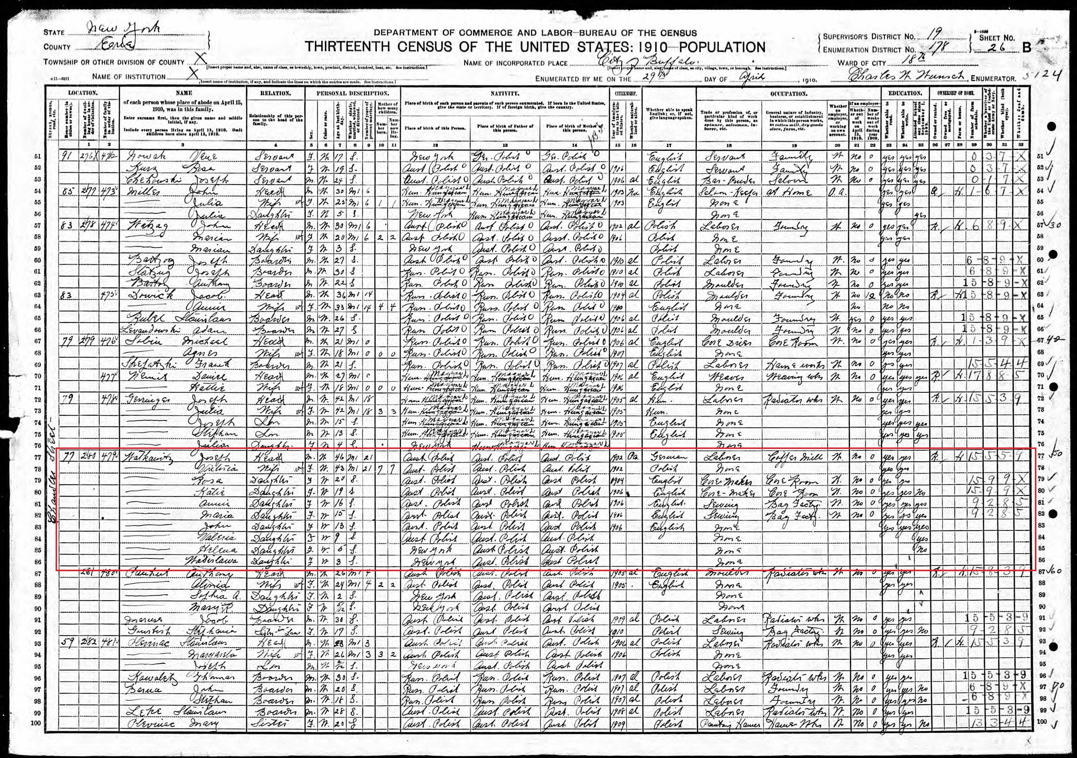 61910 United States Federal Census, Erie County, New York, population schedule, Buffalo Ward 18, Enumeration District 0178, Sheet 26B, house no. 77, family no. 479, Joseph Watkawitz household; digital image, Ancestry (https://www.ancestry.com/ : 16 February 2022), citing NARA microfilm publication T624, roll 946 of 1,178.