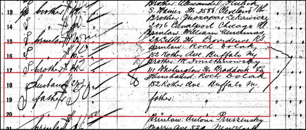 In 1910, the “Watkawitz” family was living at 77 Chandler Street in Buffalo. Examination of the family group reveals the same cast of characters we’d found on other census records, with a few new details. In this census record, “Viola” was, indeed, recorded as Valeria, and the family group included three daughters not identified previously—19-year-old Katie, 16-year-old Annie, and 15-year-old Maria. In Polish records, we might expect them to be recorded as Katarzyna, Anna, and Marianna. All of them must have been married or deceased by 1920, since it would have been atypical in Polish-American culture for unmarried girls to be living independently. The grandmother, Teresa Klocek, is absent from this record, as expected based on prior evidence that she immigrated circa 1913.
