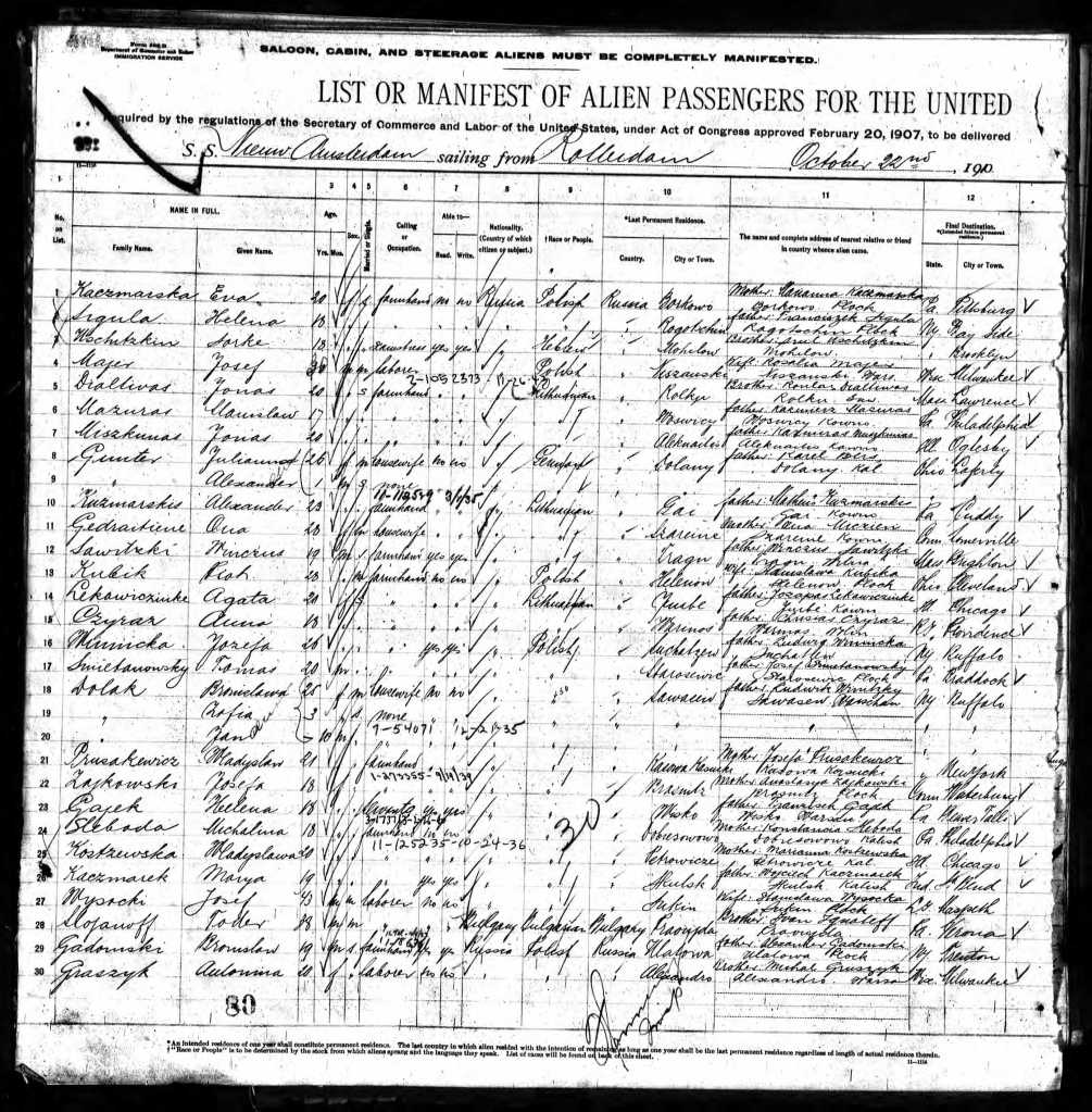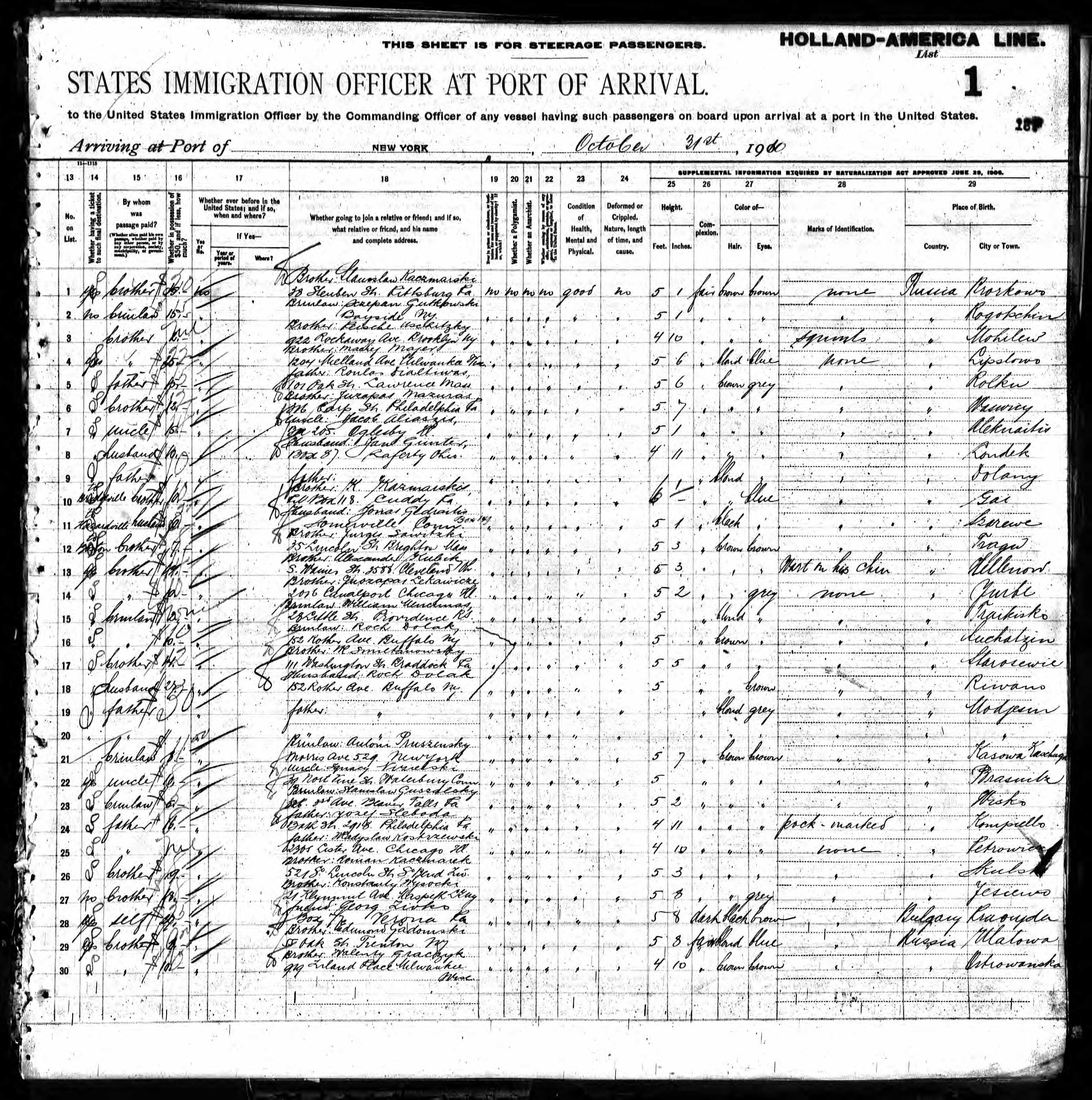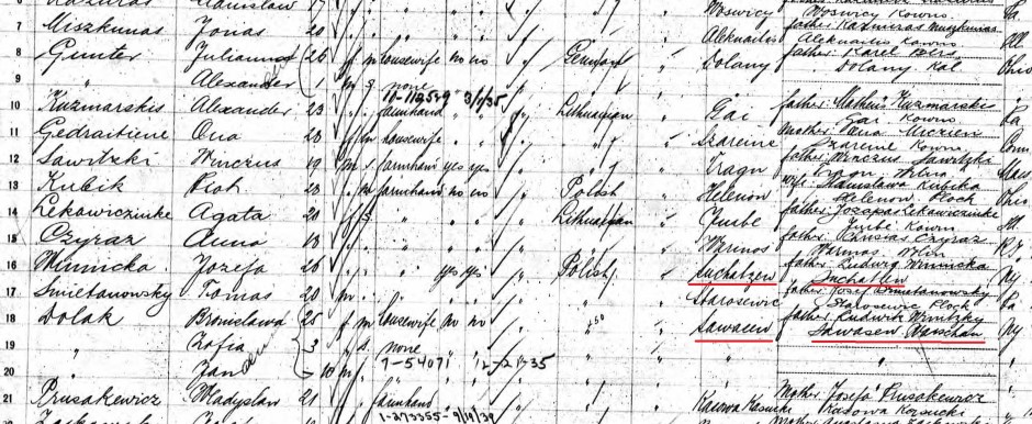 I was willing to bet that both of these spellings, “Suchatzew” and “Suchatzin,” were intended to refer to either the town of Sochaczew, or the county of Sochaczew, so I believed this was good evidence that my assumption was correct about Andrew Lukasik marrying a girl from his hometown. However, this manifest offered further confirmation of her place of origin, because Józefa was not traveling alone. Although it was not immediately obvious from the first page of the manifest, the second page of the manifest shows Józefa on line 16, bracketed together with three other passengers who were recorded on lines 18, 19, and 20 (Figure 3).