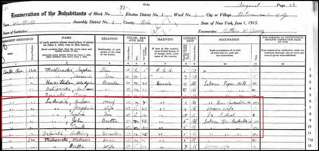 1 1915 New York State Census, Niagara County population schedule, North Tonawanda Ward 03, Assembly District 01, Enumeration District 01, p 33, lines 6-11, Andrew Lukasik household; digital image, Ancestry (https://www.ancestry.com/ : 22 April 2022).