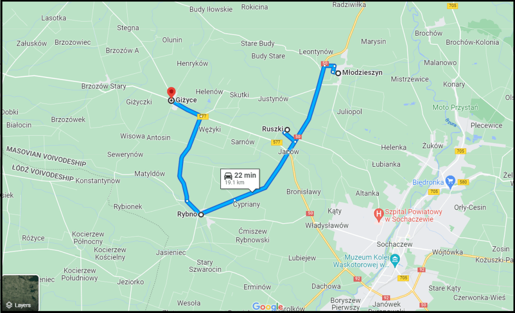 Figure 8: Map showing locations of Młodzieszyn, Ruszki, Rybno, and Giżyce, relative to the county seat, Sochaczew, to the southeast.