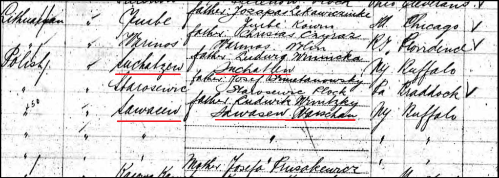My Polish cousin informed me that the Łukasiks were from the parish of Młodzieszyn in Sochaczew County—information which was unsurprising to me, since I’ve found that many of the Polish immigrants who settled in North Tonawanda were from Sochaczew County, including two of my great-grandfathers, John Zazycki and Joseph Zielinski. In fact, thanks to chain migration, census records from “the Avenues” (North Tonawanda’s Polish enclave) read very much like a roll call of the families found in church books from Sochaczew County: Zieliński, Pałka, Kalisiak, Kalota, Szymański, Duplicki, Zażycki, Sikora, Orliński, Wieczorek, Pisarek, Koszelak, Rokicki, Włodarczyk, Adamczyk, Dąbrowski, Wilczek, and more. To be clear, I have not traced the origins of every Polish family in North Tonawanda with one of those surnames, and some of those names (e.g. Zieliński, Dąbrowski, Sikora) are so popular that the bearers might have originated anywhere in Poland. Nonetheless, I’d be willing to bet that many of the folks with those surnames who settled in North Tonawanda were originally from Sochaczew County.