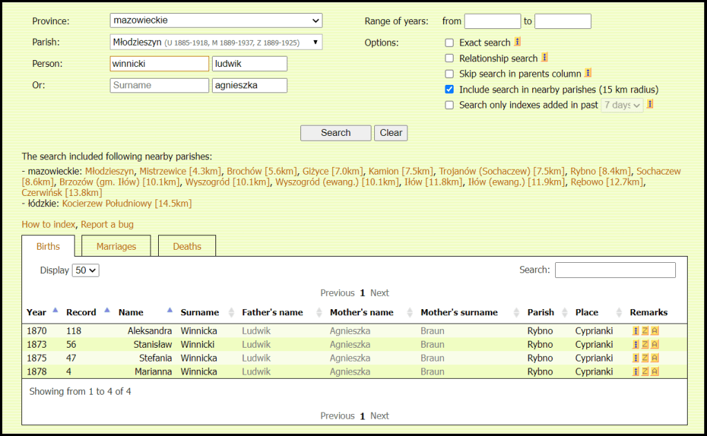 Figure 7: Geneteka search result for birth records mentioning Ludwik Winnick and Agnieszka (no maiden name specified) in indexed parishes within 15 km of Młodzieszyn. Click image for interactive search page.